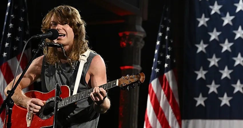 Welles is also writing about politics with, as far as I can tell, no actual understanding of what his politics are aside from an unerring antipathy for the people or systems that might have power. He demurred when Rolling Stone asked him about his vote in the 2024 presidential election: “I just … I didn’t know I’d be talking about that kind of thing.” I don’t actually care if Welles voted for Trump or Biden or Jill Stein or Air Bud, but if I’m listening to a guy who has at last found his career in music by singing about politics, I’d like to know that he has enough confidence in his convictions to justify whatever choice he made only a year ago. It is a fitting answer, though, for someone whose songs have smacked of pernicious bothsidesism from the start, when he put the two presidential candidates on the same embarrassing footing. Welles writes like a guy whose politics could change the moment it becomes professionally expedient. It’s easy to imagine him not having an audience had Kamala Harris won in November 2024; it is also painfully easy to imagine him having a massive audience had Kamala Harris won in November 2024.